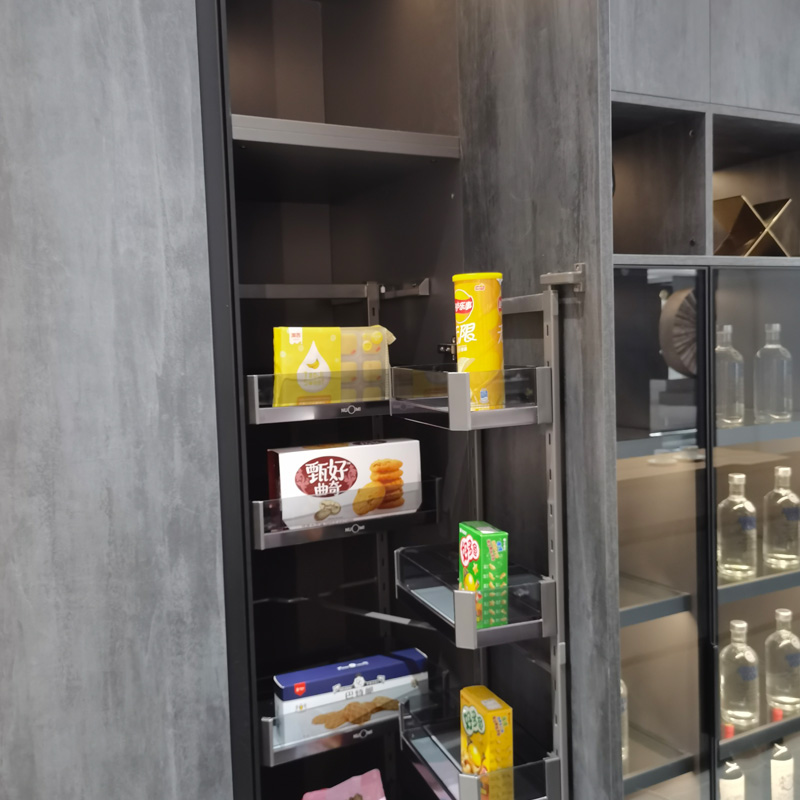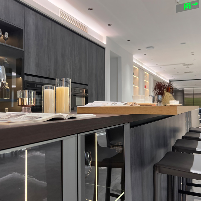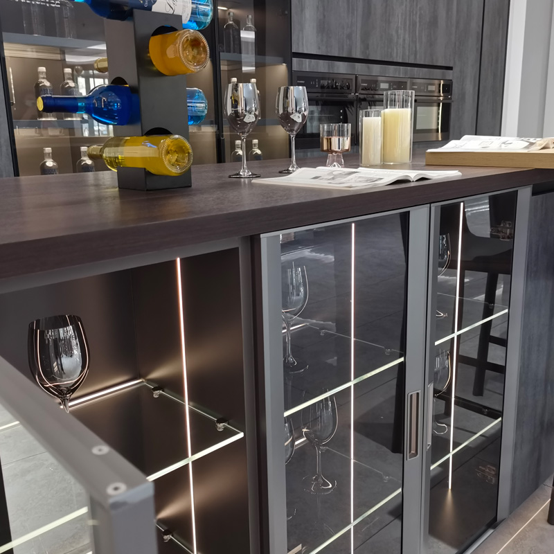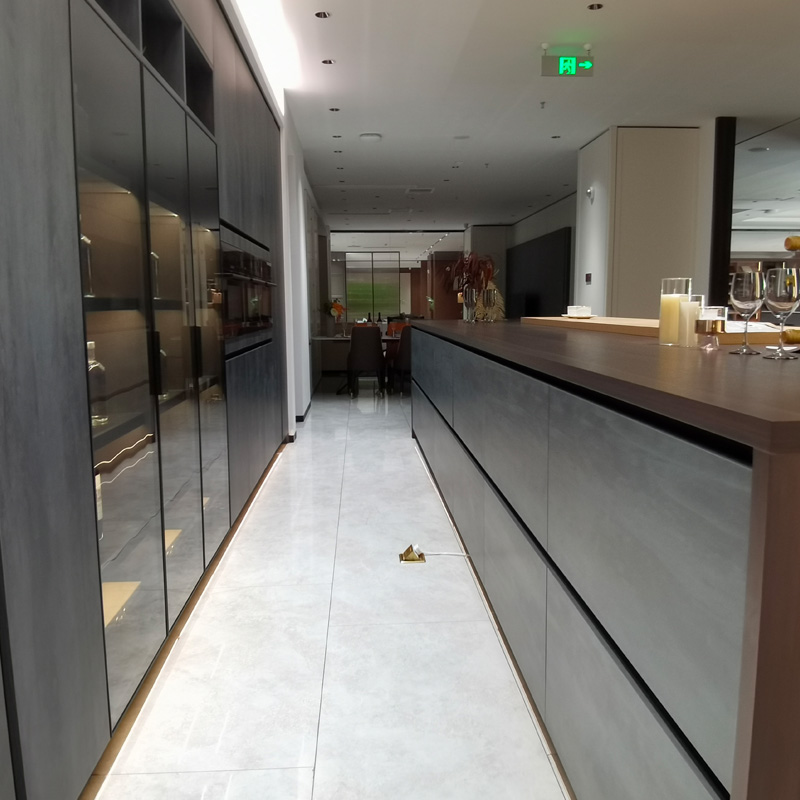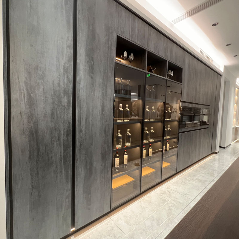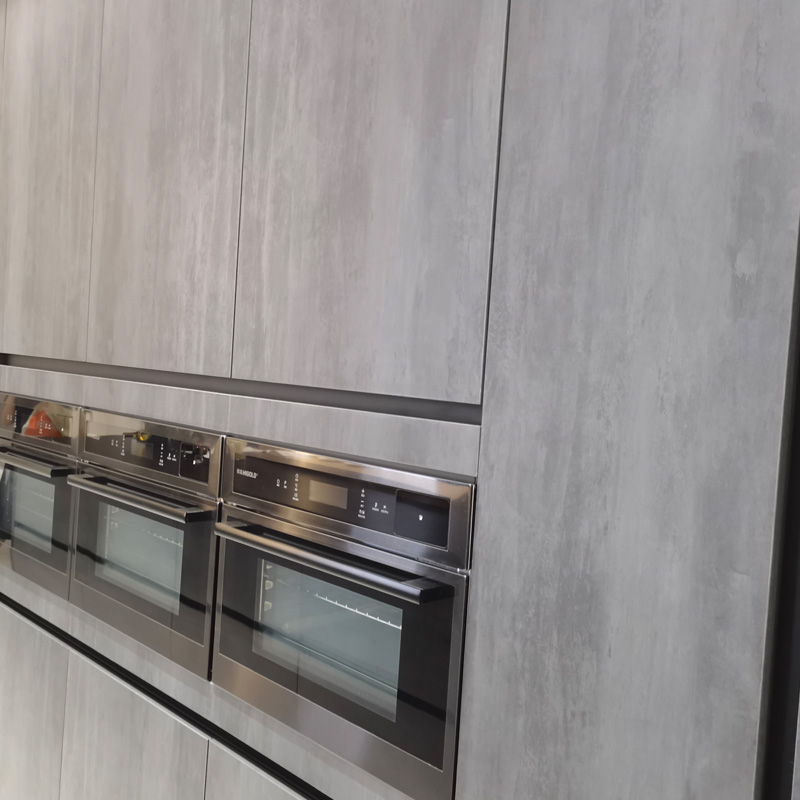 Új stílusú, divatos ipari laminált konyhaszekrény színes régi kezeléssel, mint a sziklamállás, sima és minőségi tapintású, illeszkedő üvegajtópanel alumínium kerettel, a konyhadekoráció kiemelkedő érzetét kelti. Anyaga vízálló, könnyen tisztítható, a stílus pedig nem egyszerű.